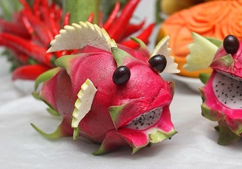 Cá bằng thanh long: dùng thanh long làm thân, vỏ bưởi làm vây, hột nhãn làm mắt.