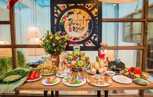 Bày mâm cỗ theo quan niệm "cầu – dừa – đủ – xoài – sung" để cầu tài lộc.